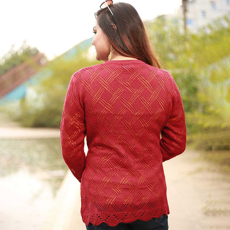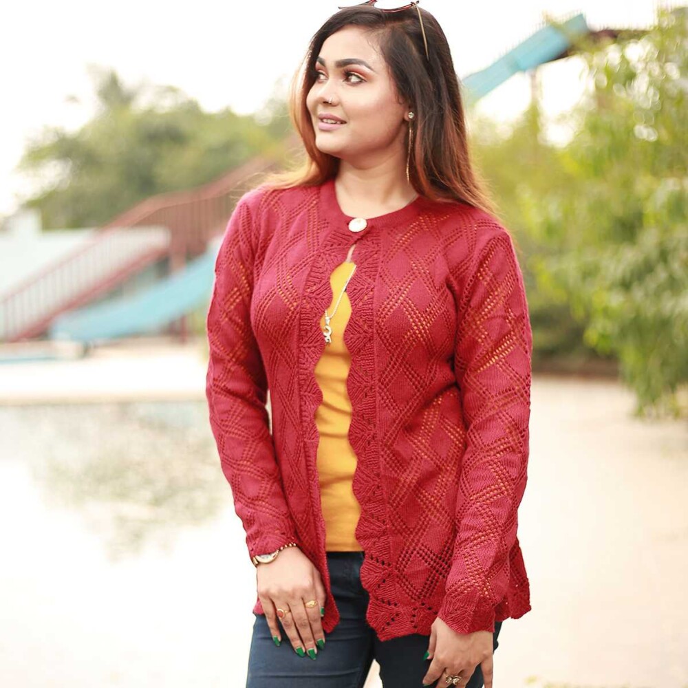Enhance your everyday style with this elegant maroon crochet cardigan. Made from soft and breathable fabric, it provides all-day comfort and a fashionable look. The scalloped open-front design and intricate patterns make it ideal for both casual outings and special occasions.