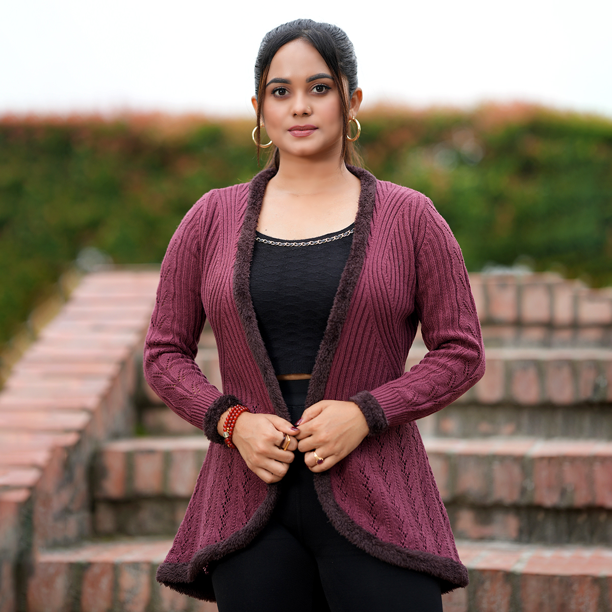 2️⃣ Black & Red Fur-Lined Winter Cardigan