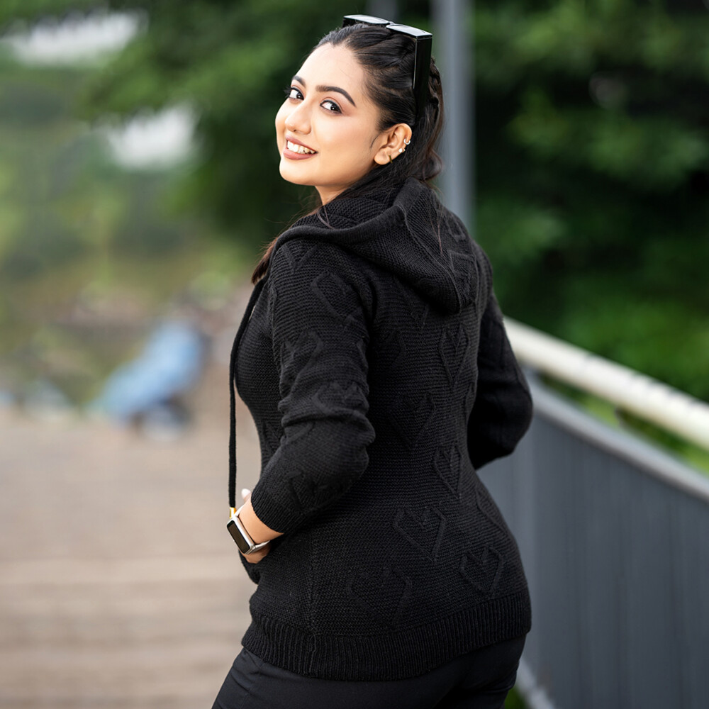 Stay warm and trendy with this Stylish Black Winter Knit Hoodie, crafted from soft acrylic wool to provide ultimate comfort during chilly days. Designed with a front zipper, drawstring hood, and kangaroo pockets, it’s perfect for a casual yet fashionable winter look. The subtle heart-textured knit pattern adds a touch of charm, making it ideal for both indoor comfort and outdoor adventures.