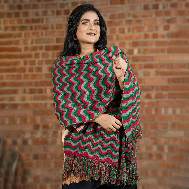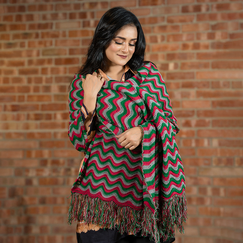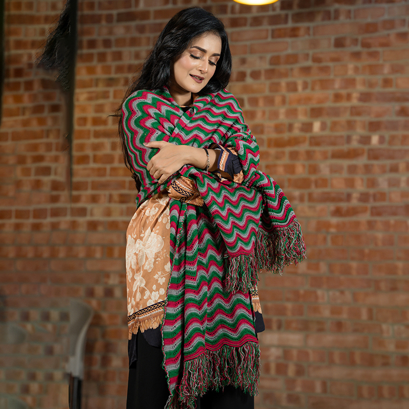 Bring color, warmth, and charm to your winter wardrobe with this stunning multicolor wave-knit shawl. Designed in a playful mix of green, red, and pink tones, it adds instant brightness to any outfit. The wavy stripe pattern and soft fringed ends give it a cozy yet stylish look — perfect for both everyday wear and festive occasions.